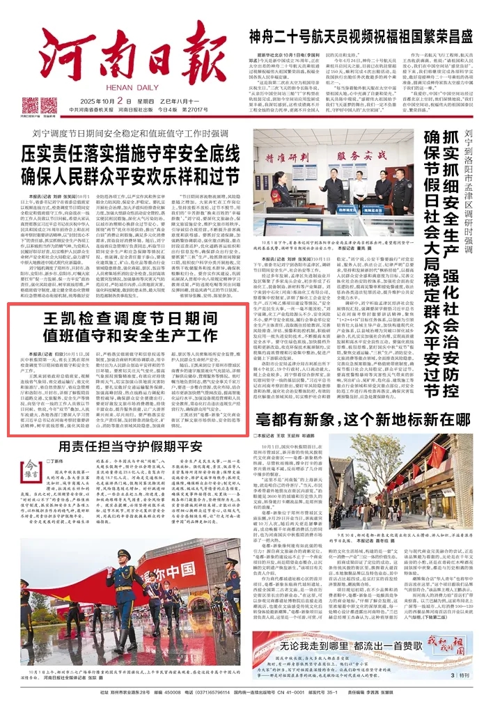 王凱來到省政府總值班室,視頻連線省氣象局、省交通運輸廳、省文化和旅游廳、省自然資源廳、省應(yīng)急管理廳和洛陽市、開封市,詳細了解假期首日道路交通、文旅服務(wù)、安全生產(chǎn)等情況,向堅守在一線的工作人員致以節(jié)日問候。他說,今年“雙節(jié)”疊加,人流車流量大,各地各部門要深入學(xué)習(xí)貫徹習(xí)近平總書記在河南考察時重要講話精神,樹牢底線思維,強化風(fēng)險意識,嚴格落實值班值守和信息報送等制度,加強會商研判和協(xié)調(diào)聯(lián)動,用辛勤付出為人民群眾創(chuàng)造平安祥和的節(jié)日環(huán)境。要密切關(guān)注天氣變化,提高氣象預(yù)報預(yù)警精準度,有效應(yīng)對持續(xù)降雨天氣,切實加強山洪地質(zhì)災(zāi)害防范。要扎實做好交通運輸服務(wù)保障,加強高峰時段、熱點線路運力調(diào)配和管控疏導(dǎo),確保群眾安全便捷出行。要更好激發(fā)文旅市場消費潛能,持續(xù)豐富業(yè)態(tài),提升服務(wù)質(zhì)量,讓廣大游客乘興而來、盡興而歸。要嚴格落實安全生產(chǎn)責(zé)任制,及時排查消除?;?、礦山、消防等重點領(lǐng)域風(fēng)險隱患,加強商超、景區(qū)等人員密集場所安全監(jiān)管,維護人民群眾生命財產(chǎn)安全。