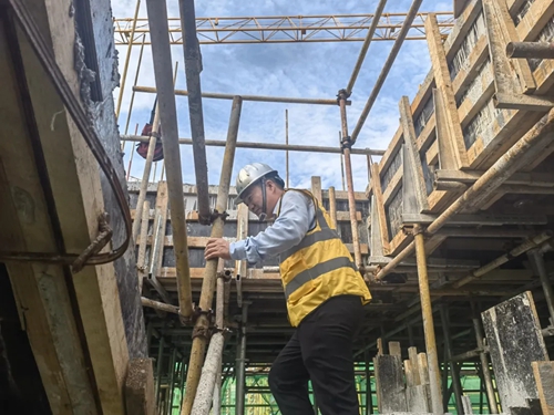 葉劉杰當天的第一個巡視目標,是31號樓3層頂板的工作面。由于現(xiàn)階段不具備安裝施工電梯的條件,只能通過樓梯上下。澆筑后的樓梯用鋼管或定型化欄桿作為護欄進行臨時防護,以保證工人的安全。